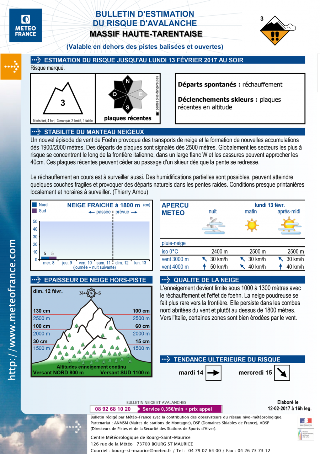 An avalanche risk rating of 3 is hardly unusual through the season; it highlights the need to be very aware of the weather reports and resort assessments, noting that there is always some risk. Here is that morning’s Metéo France report: