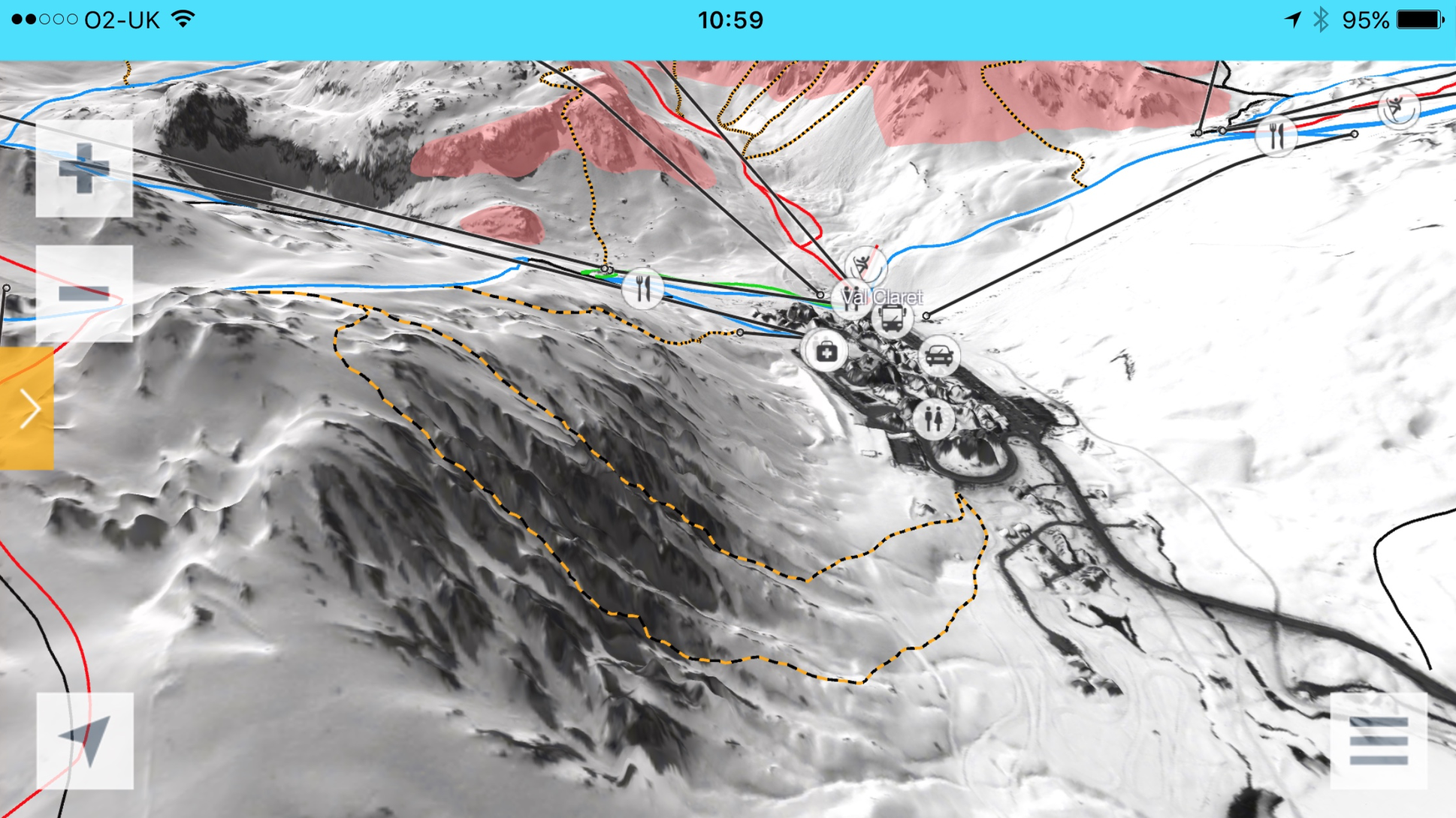 The Sky report, that hasn’t been updated, said the avalanche had been in the Tovière area. I well remember the run Mur de Paquerettes (https://m.youtube.com/watch?v=QuwFfN6ESqo) (PS not me skiing in this video) underneath the Tovière mountain restaurant, where there is live music and where the hang gliders take off. Mur de Paquerettes is a pretty steep mogul run we have skied a lot, but it isn’t in the pictures here; we don’t see the Tovière Gondola bubble lift which provides a spectator view of the mogul antics from right over the run. It is further to the right as we look here; the off-piste run in this avalanche area is down from the Lavachet Wall, and we see part of Tignes le Lavachet in the foreground.