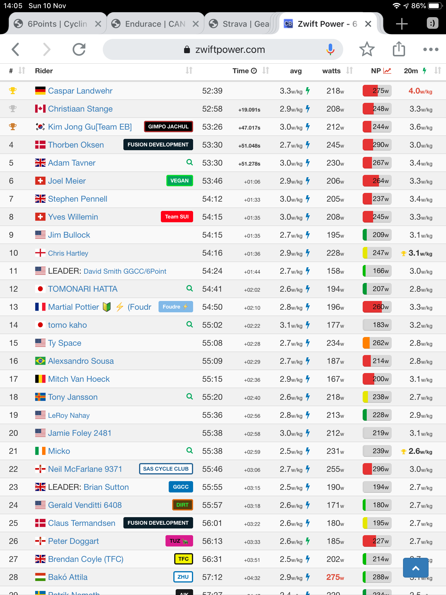 All ride data at https://zwiftpower.com/events.php?zid=246258 for those registered with ZP. Zwift Companion shows that we had 153 booked to ride, 128 starters and 79 finishers, great numbers for only our third 6Points Mallorca event. I averaged 2.5w/kg, 190w, right on the money. And there I was, mid-pack!