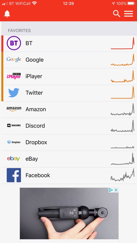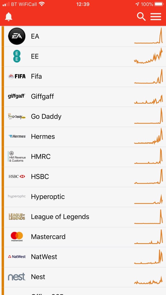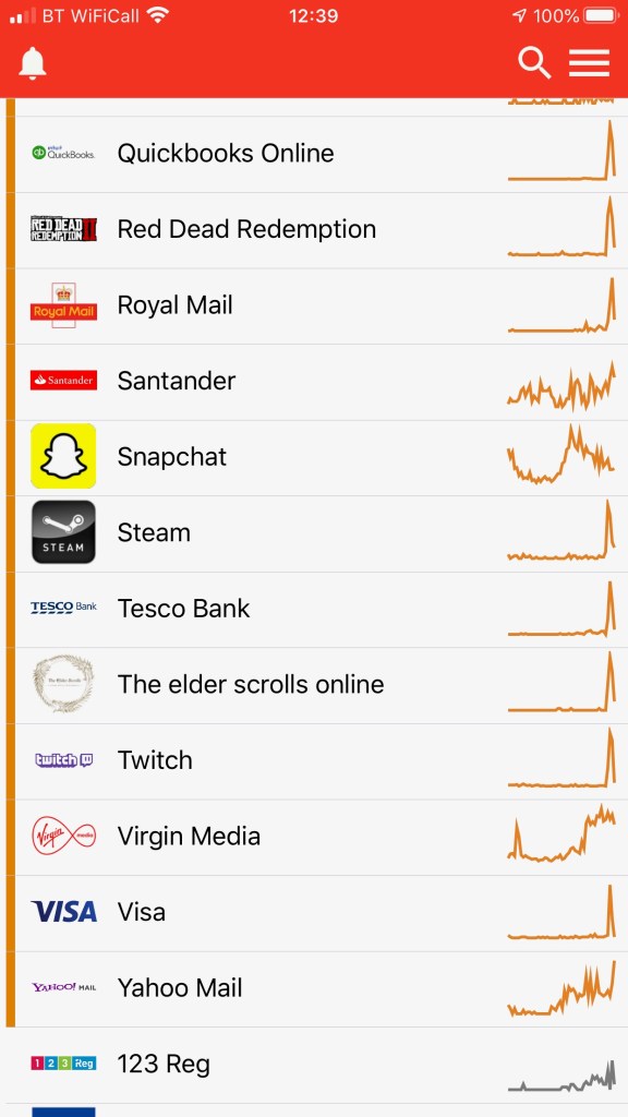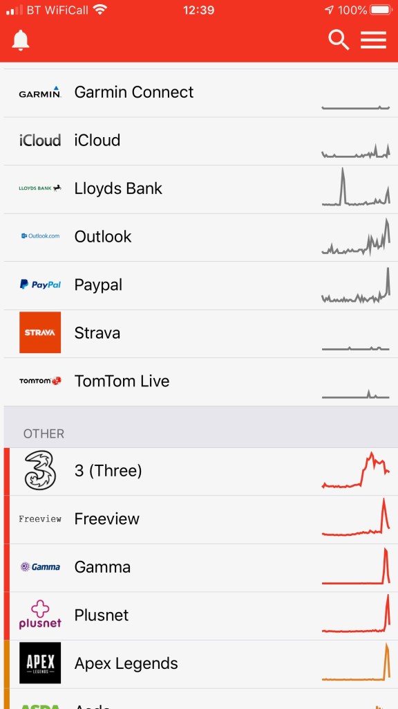 Then I looked at my DownDetector app, which tells me what problems any well-know public Internet services might be having, including ISPs like BT (mine), and LOTS had a spike in problem notifications (although not Facebook and some others). Maybe this was a geographically local issue, perhaps UK only.