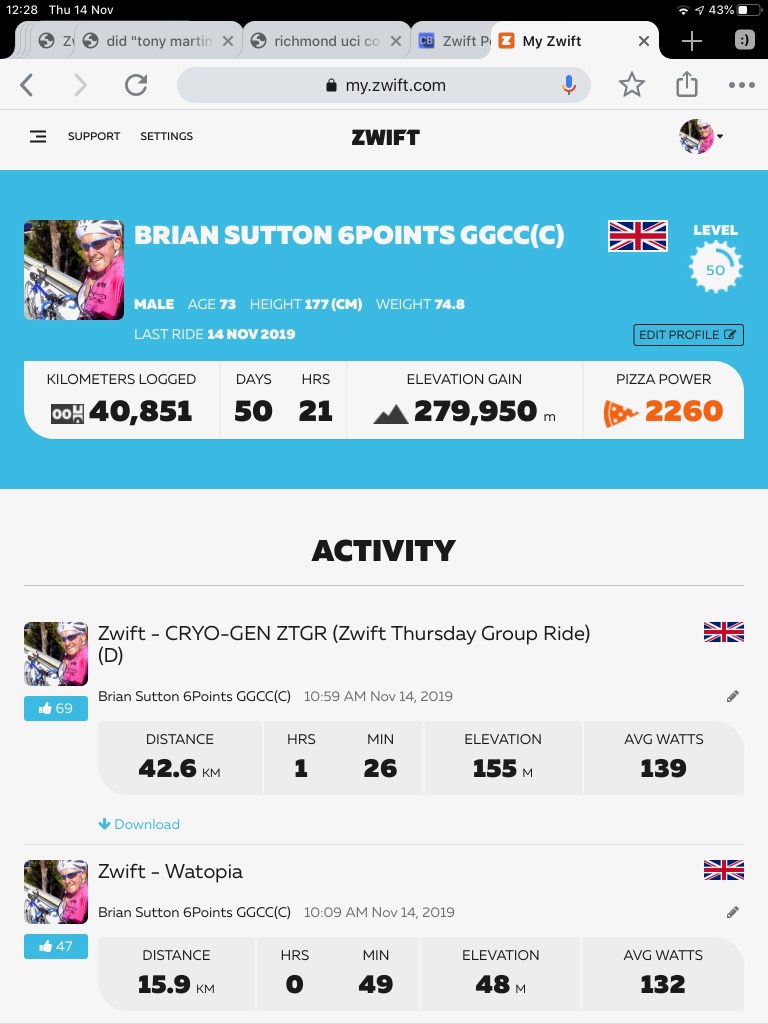 I had kept kept riding all this time (having photographed the screen a few times, without stopping the ride yet) and I went onto Zwift.com. I saw my warmup there, and also a ride (at 38.1kms) which for some reason had saved (but not on Strava!) even though I hadn’t stopped or saved the ride.