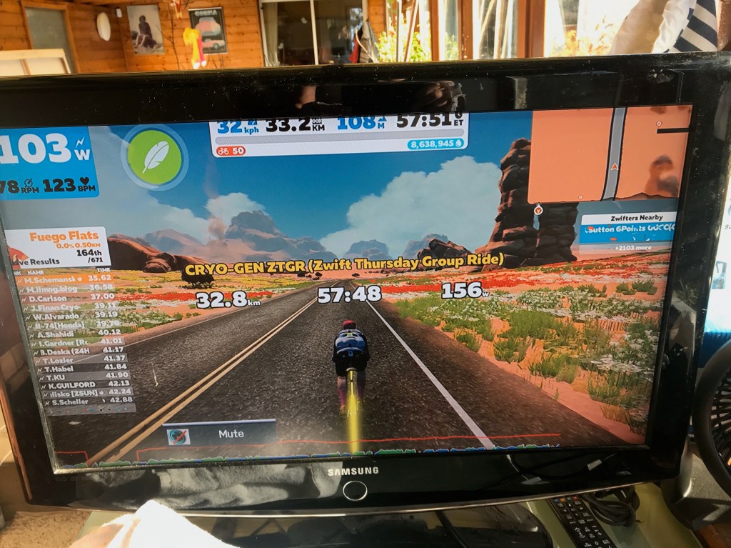 So seeing a 38.1km partial ride up on Zwift.com, though, and now that I wasn’t riding alone (ie the Internet link was re-established) I decided that rather than just turn off my Apple TV, hoping that I’d be prompted to save the ride properly when logging in next time, I would photograph the screen and attempt to save the ride normally and see what happened (I was a bit over 40kms at that point so would only lose a couple of kms at most as a 38.1km ride was already up there (somehow!)