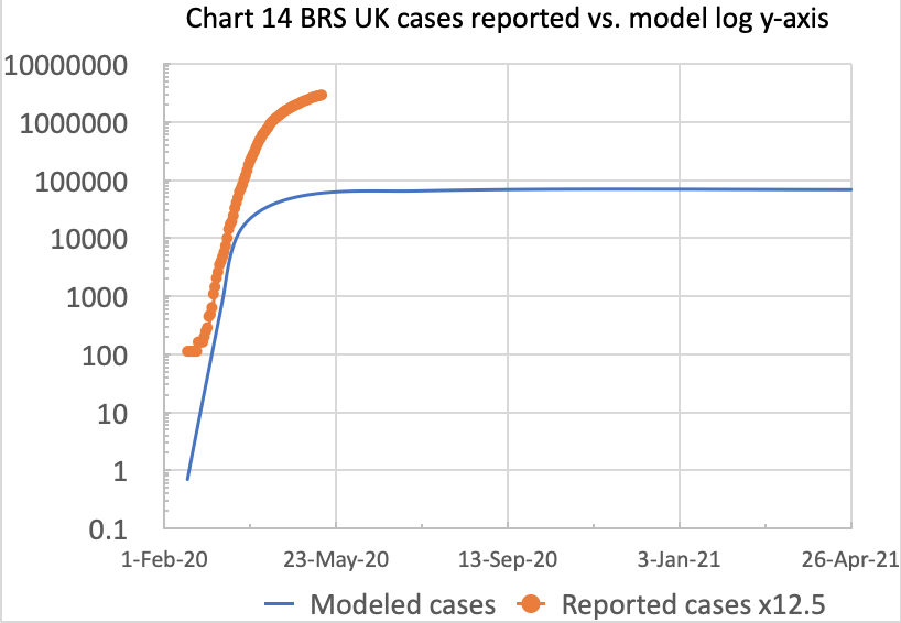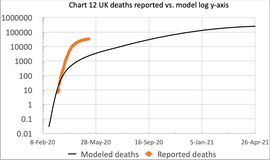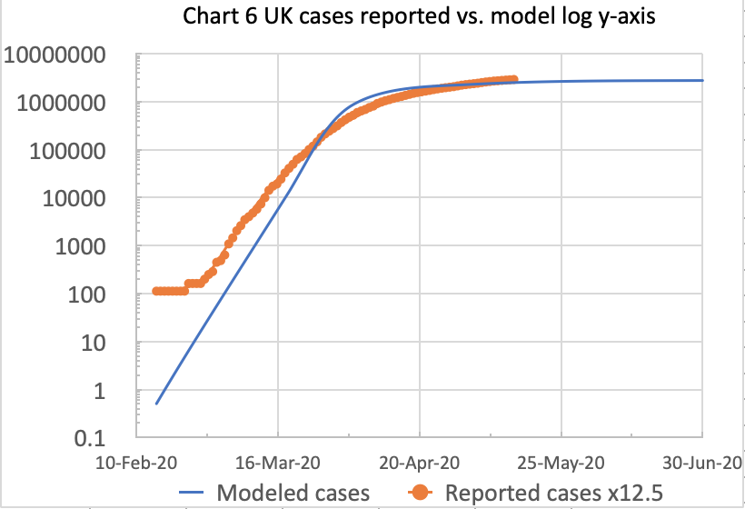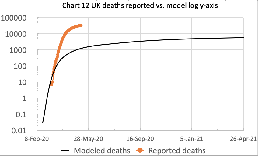 The number of cases, below, is predicted at 2.8 million in the UK, assuming that only 8% of those with the virus are actually tested and diagnosed, a percentage that is informed by the ratio of deaths to real cases derived from other countries’ experience. The fit of the model, therefore, isn’t as good for cases, as the data is fuzzy. The 12.5 multiple on reported numbers mentioned on the chart takes account of that 8%.