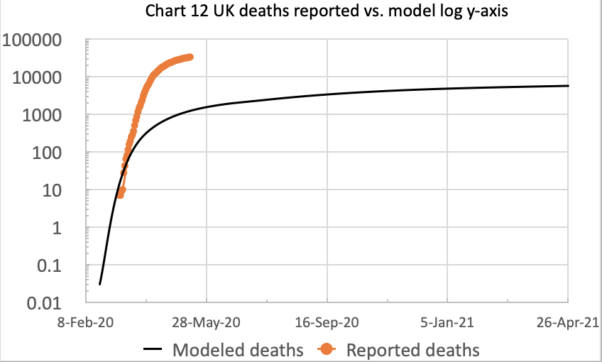 A major problem with running any model from 9th March for the UK is that the first UK deaths, specifically attributed to Covid-19, on the original basis, prior to the inclusion of Care Home figures, were on the 10th March, although, of course, there had been many more cases of infection reported, with people being admitted to hospital and ICU departments in the hundreds. I’m sure that, as discussed above, there will have been deaths associated with the pandemic, but not officially recorded as such.