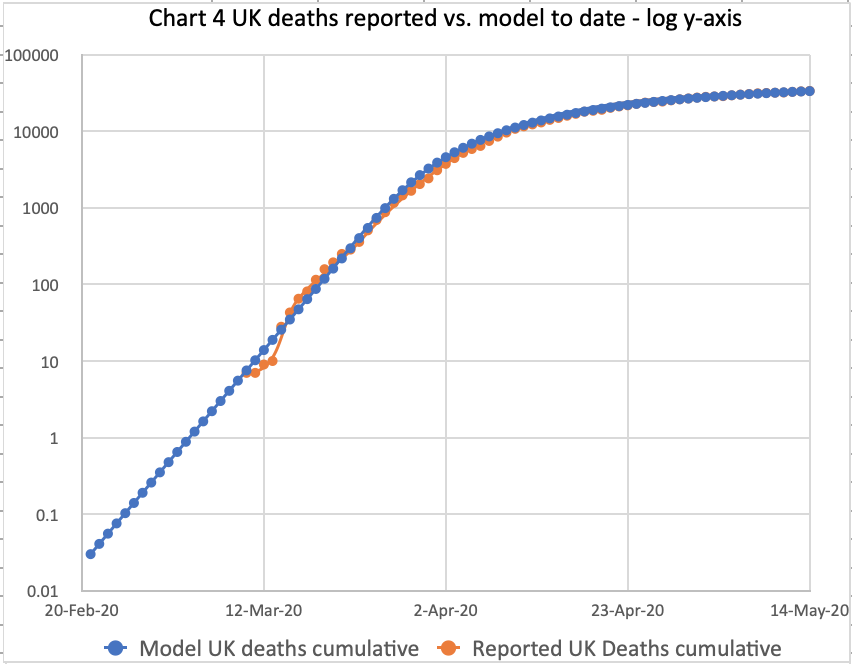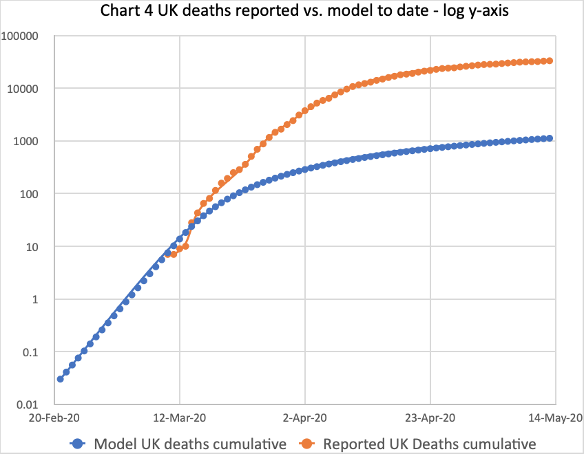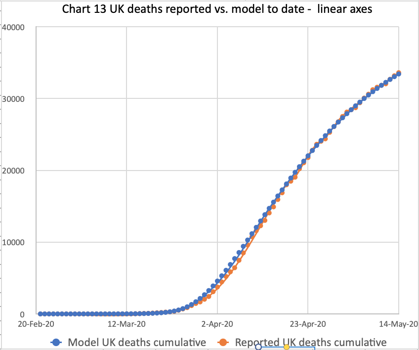Visually, the reported deaths look very unlikely to get anywhere near that, and in my base March 23rd lockdown model (which has a good fit with reported numbers at the moment, May 13th, the orange curve here), deaths are projected to flatten at 42,000, with cases at 2.8 million.
