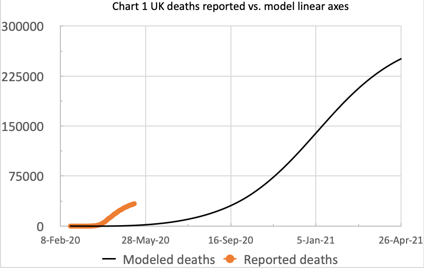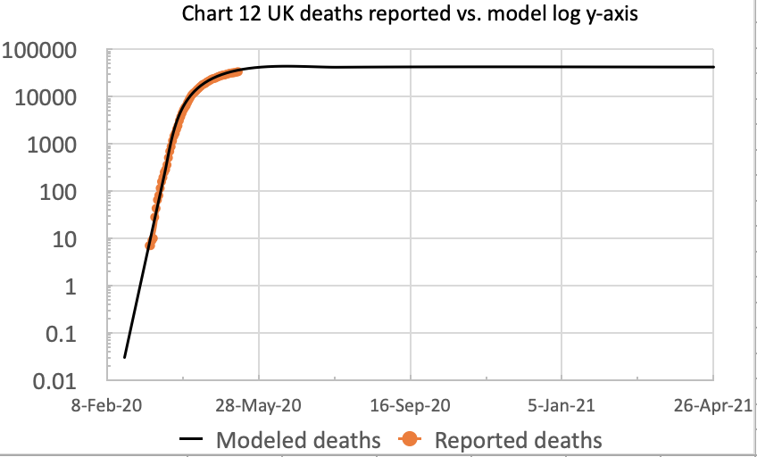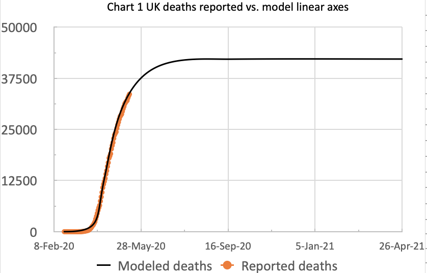 My model projection is broadly in agreement with the following projection from the IHME, the Institute for Health Metrics and Evaluation, an independent global health research centre at the University of Washington, which forecasts between 43,000 and 44,000 deaths in the UK by the summer.
