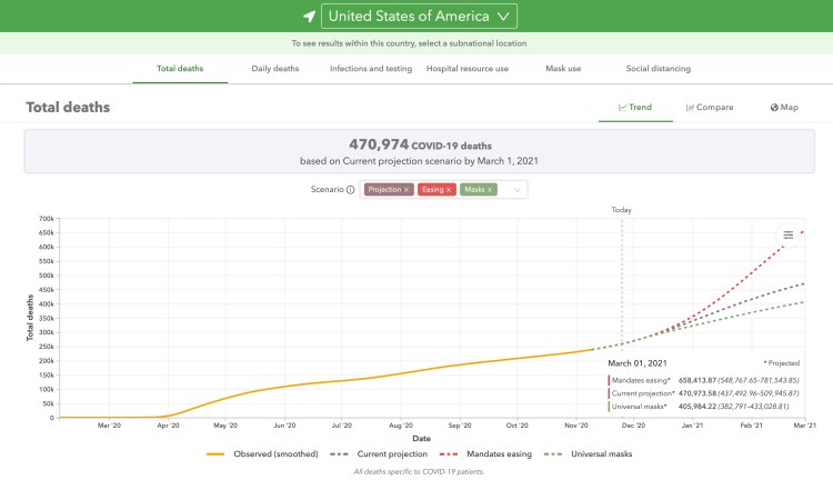 and so we see that the University of Washington projection and my model aren’t so far apart, as before, when I reported in my November 10th blog post. Assumptions, however, are probably somewhat different between their approach and mine, so interpretations of these charts should be made with caution. Three principal assumptions are shown on all of the University of Washington projections, and error ranges can be shown too.