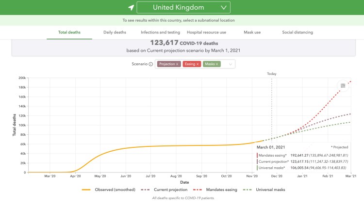 As I said last time, the model shows that a vaccine available at the outset of the epidemic would have kept UK deaths below 20,000 at the present time. The cumulative impact of the pandemic in the UK and worldwide through 2020, without a vaccine, has been tragic.