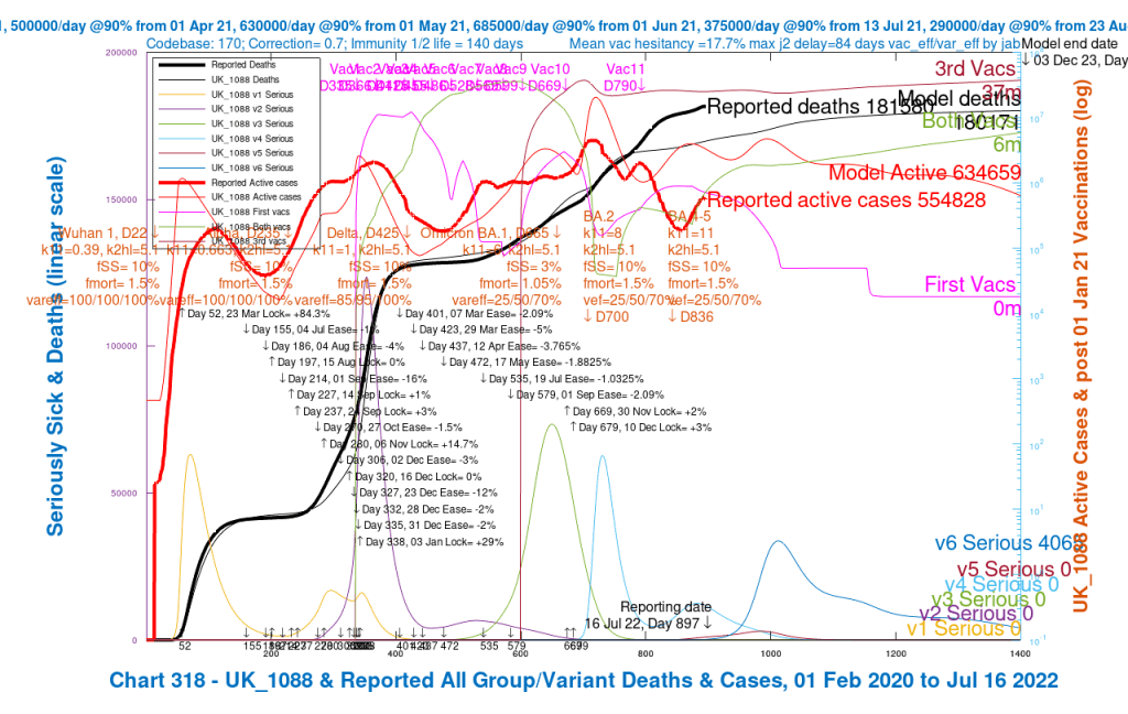 Finally, I show the scenario UK_1196 with all NPIs removed, a change of -79.64%, which removes the cumulative NPIs of 79.64% as they stood just prior to February 24th, with Omicron BA.2 having the same virulence and mortality as BA.4/5. Click here to return to the detailed extract from this chart, highlighting the divergence between Active Case and Death rates.