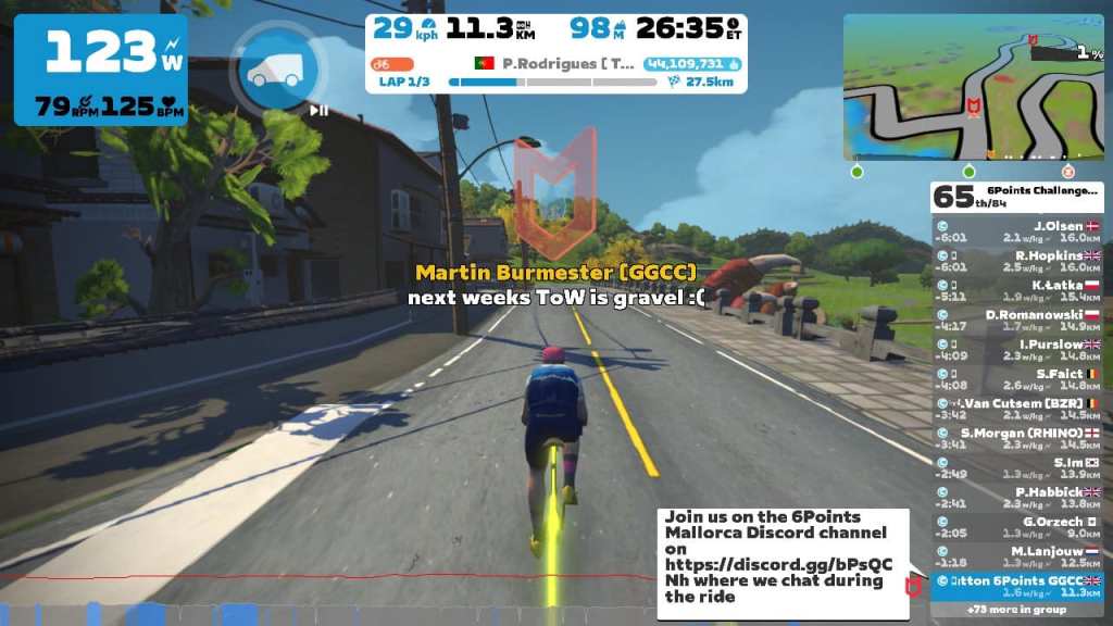 We also use the Discord chat system on our rides, so just as in real-life rides, we can chat to those riding with us. We use the dedicated 6Points Discord channel I remind riders about in the screenshot below, and use earbuds and microphone, connected by Bluetooth to the Zwift “game”, just as many gamers do.