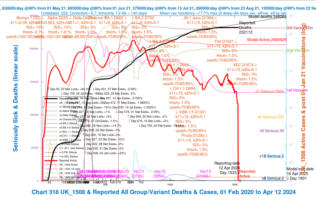 My latest full report, “My Coronavirus model post-Pirola”, was published on October 12th 2023. Vaccines controlled the pandemic fairly well then, combined with much greater public awareness about how personal behaviour can help infection control. It was based on version 216 of my model and dataset UK_1445, and showed Pirola was the tenth main variant we had encountered in the UK, although there had been many sub-variants.